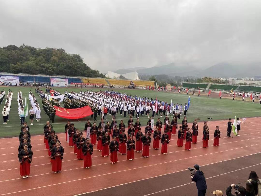 恰同学少年,风华正茂;呈飒爽英姿,试比天高。仪仗队自信又庄重,方阵队伍也各展风采。其中,人文学院的方阵更是一道别样的风景线,黑红色的汉服端庄典雅,显古典风范,一个抱拳礼拱手于胸前,展华夏之礼。