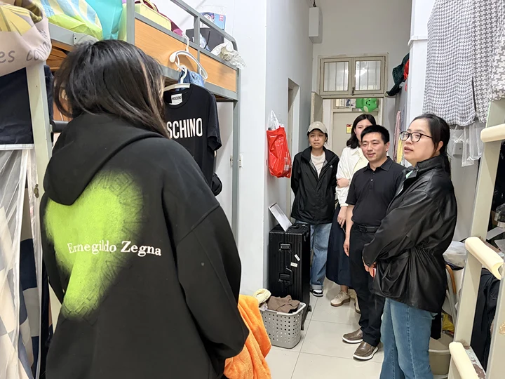 院领导一行首先来到男生宿舍,了解学生寝室卫生状况及内务规范情况。对于个别卫生死角及物品杂乱的现象,当场提出整改意见,要求学生即刻落实“即知即改”。在安全隐患排查环节,老师们着重强调了违规电器使用的严重性,重申了学校关于严禁使用热得快、电磁炉等大功率电器的管理规定,告诫全体同学务必强化底线思维与红线意识,坚决杜绝私拉乱接行为,务必“人走断电”。