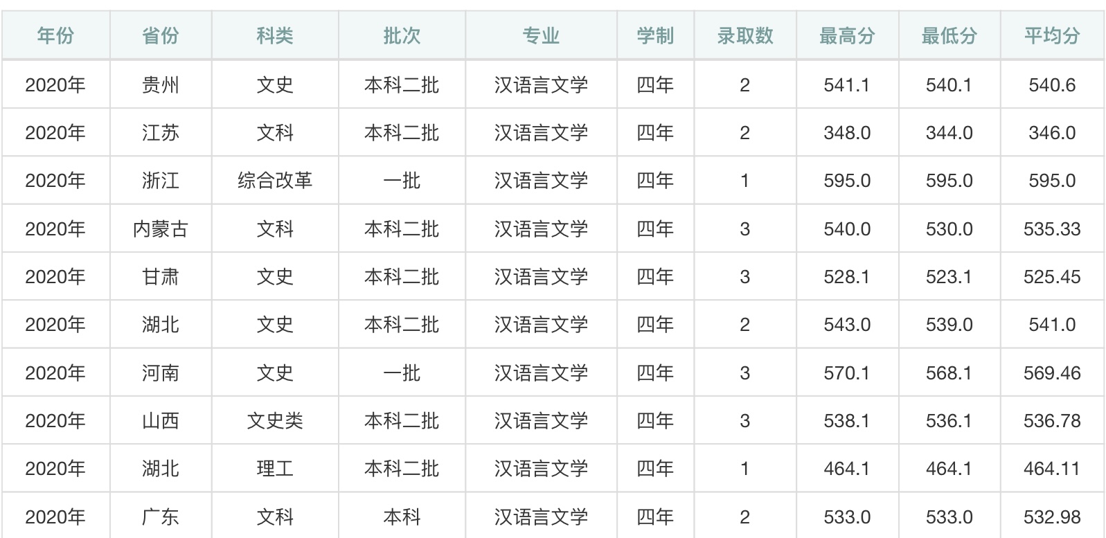 2020年汉语言文学专业招生和录取分数情况