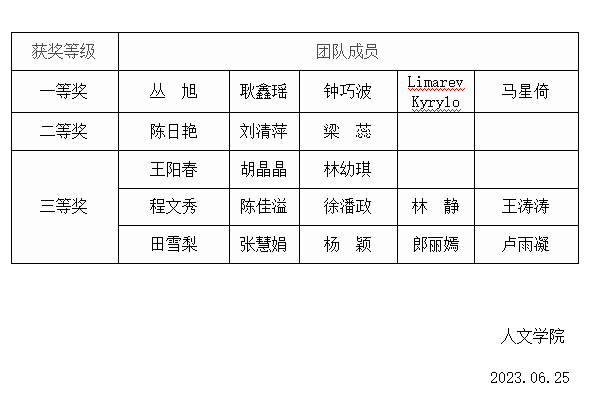根据“关于组织参加2023年浙江科技学院人文学院‘汉教英雄会’国际中文教学技能交流初赛的通知”要求,经自主报名,专家评审,评选出一等奖一组,二等奖一组,三等奖三组。现将获奖名单公布如下: