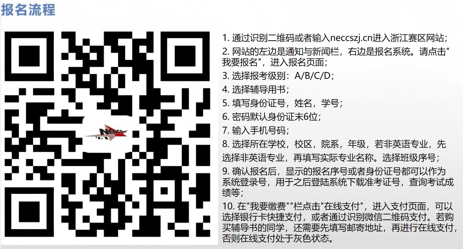以个人为单位通过识别二维码或登录neccszj.cn浙江赛区网站报名并缴费。具体操作办法见下图“2026年全国大学生英语竞赛浙江省赛区官方报名二维码和报名流程”。