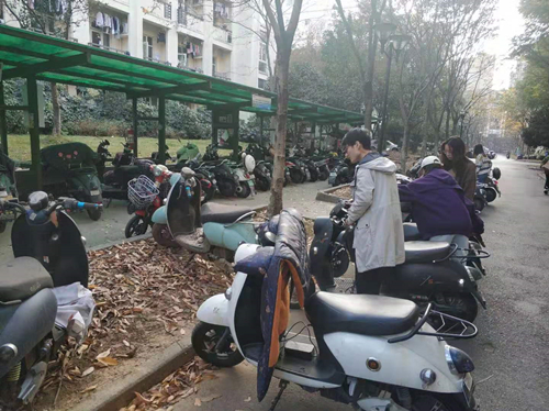 学生党员将随意停放的电瓶车排放整齐
