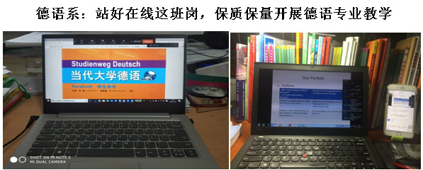 根据各级有关部门安排和指示,以疫情防控期间保质保量开展德语专业在线教学为目标导向,德语系于2020年2月初开始积极准备德语专业在线教学相关工作。一是做好教学安排预案。系部上下统一思想,利用QQ和微信群保持密切沟通和高度协作。严格遵照教务处2019-2020学年第2学期本科教学工作安排,提前做好疫情防控期间的教学安排预案,汇总教学组织和管理工作实施情况一览表,对本部门存在的相关问题进行汇总并提出解决方案和改善建议。二是做好各项摸排工作。摸排专业课程的线上授课平台,积极开展在线教学技术学习,并联系各大出版社寻找教材电子版和音视频资料,保障教学资源及时到位,针对线上教学模式的需求重新备课,合理设计分享界面的教学板书。此外,做好各项信息汇总,完成教学组织安排、教学联络人信息以及不能开展网络课程的课表调整申请表的汇总工作。三是站好每一班岗位,扮演好每一个角色。虽然德语系师资短缺,但每位教师既站好教学岗,也做好专业班班主任工作,她们以专业班级为单位,高效完成学生数据和授课教师数据的汇总,并为专业学生传达好校公选课信息。四是做好线上测试工作。在正式开展线上教学之前,任课教师做好线上教学的各平台测试,并及时反馈测试情况,提前发现问题,积极调试,做好预判,对可能出现的问题提前准备好应对方案,确保德语专业在线教学保质保量地开展。