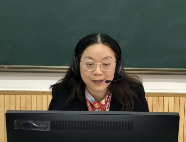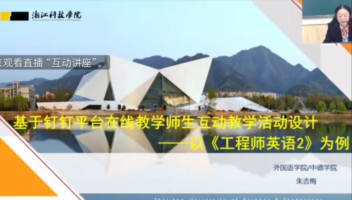 随后朱吉梅教授开始讲座,分别从现实背景、理论基础和实践操作三个方面层层递进,梳理了疫情期间上级教育主管部门和学校发布的一系列文件,指出在当前疫情突发且持续的背景下,采用线上教学方式是实现“停课不停教”的必然选择。同时引用多篇文献介绍互动教学的理论基础、方案和方法。朱老师认为基于互动教学理论的钉钉教学平台能够帮助教师及时掌握学生课堂表现,提高教学互动的有效性,随即向大家实际演练了如何在钉钉平台操作实现教学目标,教学中还选取了疫情防控期间的优秀人物事迹融入课堂教学,实现课堂思政与专业教学的有机融合。