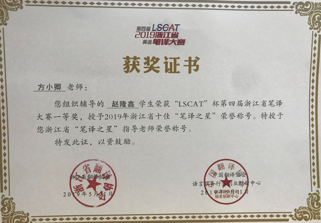 第四届浙江省“LSCAT杯”笔译大赛也是我省近年来最重要的翻译赛事,对译文要求较高,得奖率设置得不高,全省一等奖得奖率仅有3%,二等奖为7%,三等奖为10%,优胜奖为35%。此次比赛外语学院共组织我校179名选手参赛,其中英译汉128名,汉译英51名。我院学院专门为参赛选手分配了翻译指导老师。在英语系方小卿、韩晓亚、冯巧娥、吴青老师的细心指导下,我校大赛成绩斐然。我校学子斩获省级一等奖5名,二等奖2名,三等奖2名,优胜奖15名,其中英语17级赵隆鑫同学获得浙江省口译之星的称号。