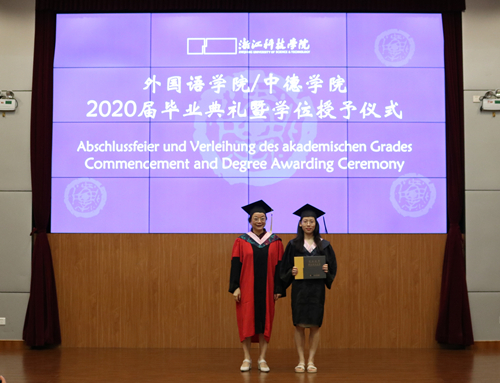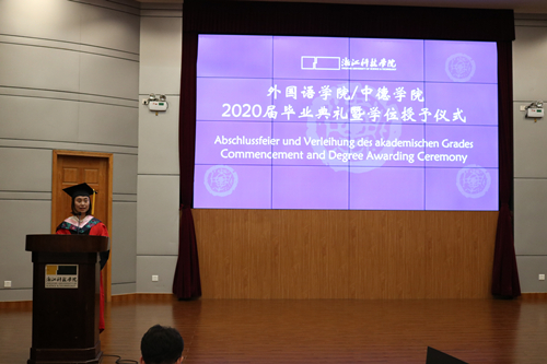 栀子花开季,毕业离别时。6月29日下午,外语学院/中德学院2020届毕业典礼暨学位授予仪式在图书馆西报告厅举行。院长朱吉梅,党委书记汤力峰,副院长王旭莲、韩晓亚,党委委员、英语系系主任方小卿,德语系系主任德语161班班主任林方,英语系王金生教授,英语161班班主任范琳,英语162班班主任冯巧娥,辅导员高卓出席。活动由党委副书记戈洪伟主持。