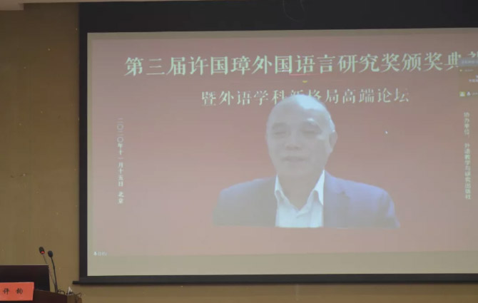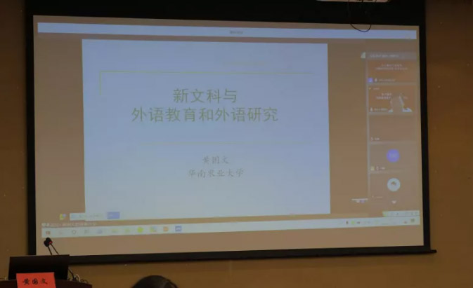 华南农业大学外国语学院院长黄国文教授以《新文科与外语教育和外语研究》为主题作了主旨报告。他以新时代教育的根本问题为切入点,指出新时代教育的共同点、外语学科与其他学科的关系、新文科视域下的外语教育和外语研究问题,并强调各高校必须凝练外语学科的特色,要依靠母体学校的特色和发展规划。黄国文教授解读了新文科之“新”,就新文科背景下外语教育和外语研究指明了方向,要依靠母体学校的特色和发展规划,外语专业在母体学校找到自己的定位。外语学科要在本校找到自己的位置,发挥自己的作用,才会有一席之地,这跟许钧教授的观点遥相呼应。