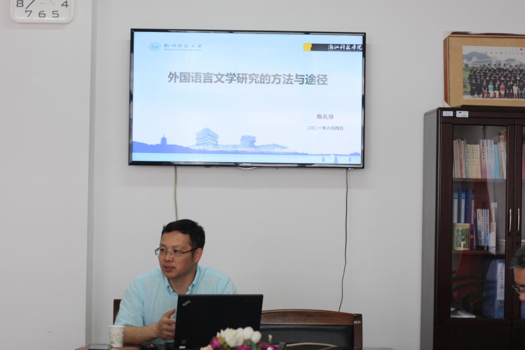 2021年6月4日(周五)上午,应外国语学院的邀请,杭州师范大学陈礼珍教授在闻理园A3-306做了题为“外国语言文学研究的方法与途径”的学术讲座,我院B5岗级以上教师、全体博士以及中德学院的部分教师参加了此次讲座,讲座由外国语学院院长樊燕龙主持。
