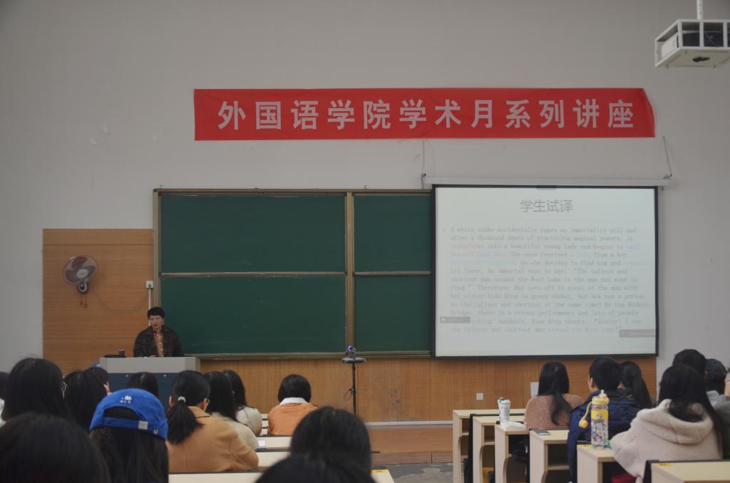 2021年11月19日,浙江外国语学院陈科芳教授应邀来我校安吉校区,为我院学生做了题为“中国民间故事英译探索和本科生科研项目申报”的讲座。讲座由外国语学院党支部副书记、副院长方小卿主持。