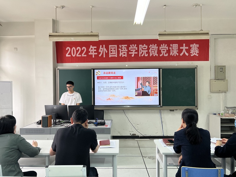 为深入学习贯彻习近平新时代中国特色社会主义思想,喜迎党的二十大,5月19日下午,外国语学院举行了以“喜迎二十大 奋进新时代”为主题的微党课大赛。