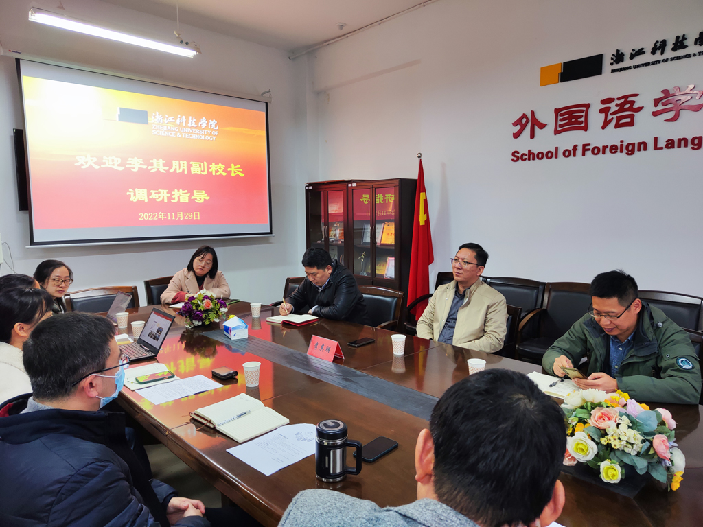 11月29日下午,校党委委员、副校长李其朋来外国语学院、中德学院调研指导,科研处处长马伟锋、副处长伦玉敏和校办人员陪同,两个学院班子成员参加。