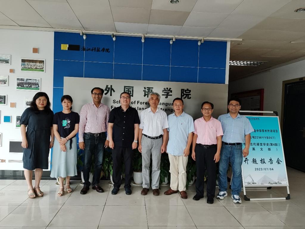 2023年7月4日下午,外国语学院召开我院2023年国家社科基金中华学术外译项目《中国古代语言学史(第4版)》开题报告会。浙江省外文学会常务副会长、浙江省翻译协会副会长、浙江大学博士生导师庞继贤教授,浙江科技学院硕士生导师税昌锡教授,浙江大学博士生导师、浙江省“西湖友谊奖”外籍专家英兰教授应邀担任评审专家,浙江科技学院科研处处长马伟锋出席并致辞,外国语学院相关项目组人员参加了此次会议。会议由外国语学院院长樊燕龙主持。