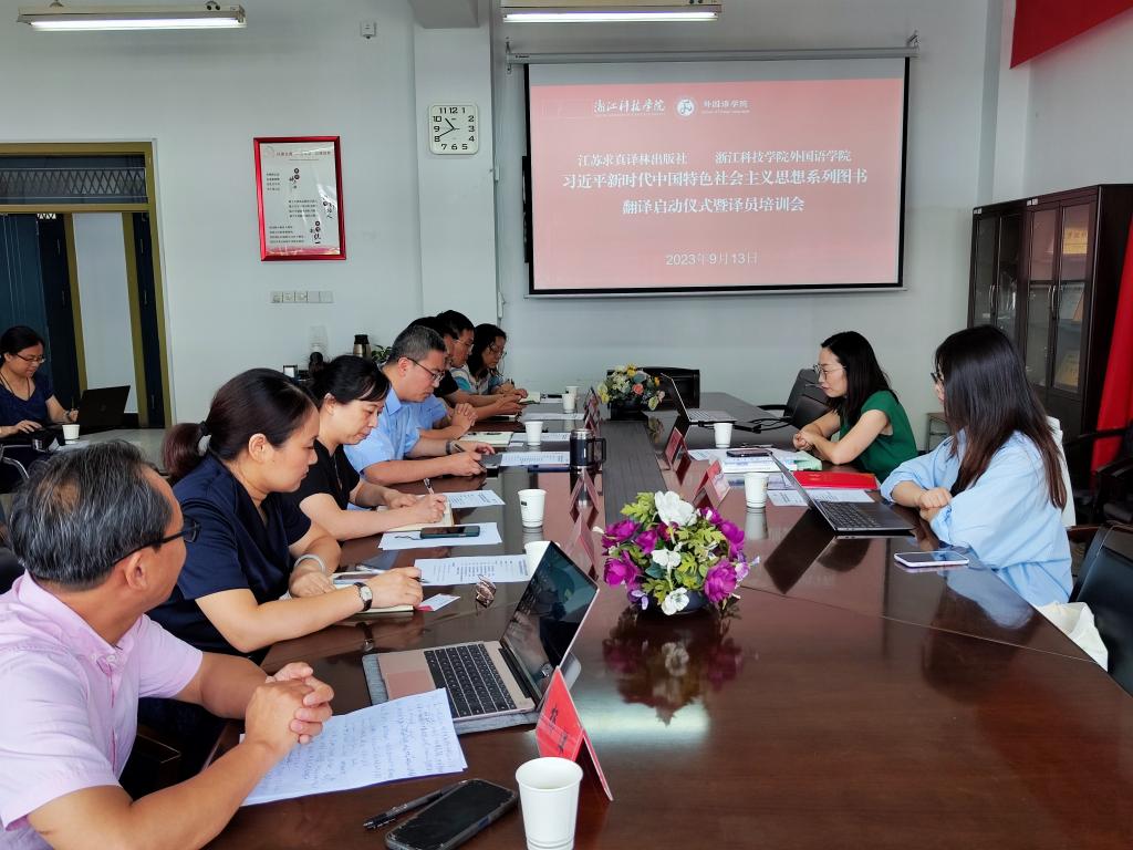 9月13日,习近平新时代中国特色社会主义思想系列图书翻译启动仪式在外国语学院举行。江苏求真译林出版社副社长高燕、社长助理江凤鸣、校党委宣传部副部长何俊杰、校科研处副处长楼天宇、中德学院院长韩晓亚、图书馆馆长朱吉梅、外国语学院总支书记丁炳泉、外国语学院翻译研究所所长杨洋及相关翻译子项目团队成员参加了此次启动仪式,会议由外国语学院院长樊燕龙主持。