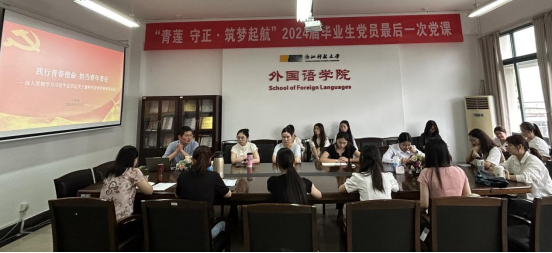 6月24日下午,外国语学院在A3-306举行“‘青莲’守正·筑梦起航”2024届毕业生党员最后一次党课,学院党委书记丁炳泉为即将步入社会的大四毕业生党员准备的最后一次精神洗礼。本次党课以“践行青春使命 担当青年责任”为主题,深入贯彻学习习近平总书记关于新时代好青年的重要论述,为毕业生党员的未来发展指明方向,注入强大动力。党课由党委副书记方小卿主持,组织员、辅导员和2024届全体毕业生党员参加。