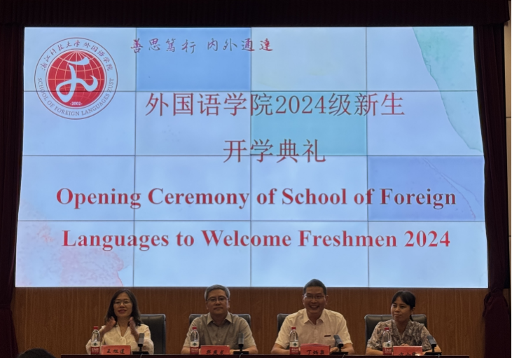 9月25日晚,外国语学院2024级开学典礼在小和山校区图西报告厅举行。院长樊燕龙老师、副院长王旭莲老师、党委副书记兼副院长方小卿老师,以及系主任、全体新生班主任、辅导员老师、校友代表与2024级本科新生和二学位新生一起参加了开学典礼,开学典礼由党委书记丁炳泉主持。