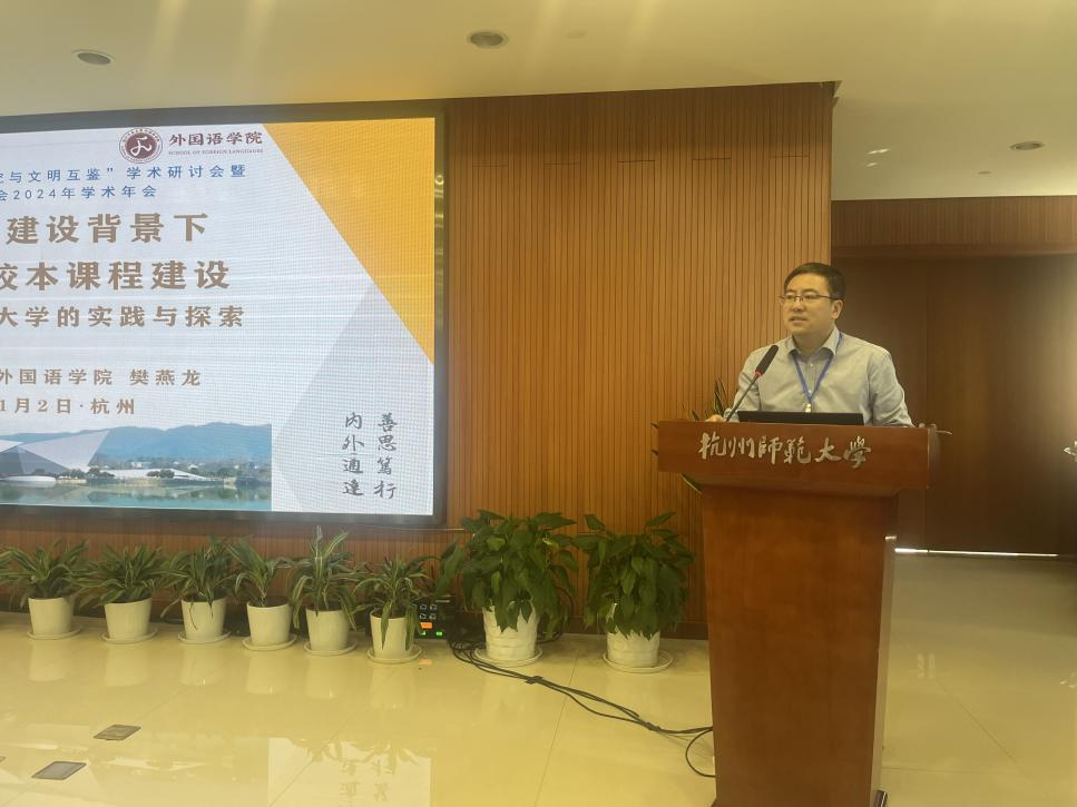 此外,杭州国际城市学研究中心副处长李燕、杭州市外文学会会长孙立春教授以及学会各副会长,也分别就各自的研究领域进行了主旨发言,为大会注入了多元视角和丰富内涵。我院院长樊燕龙做了题为“‘四新’建设背景下大学英语校本课程建设——浙江科技大学的实践与探索”的主旨报告。樊院长详细阐述了在当前“四新”建设背景下,大学英语校本课程的建设背景、课程体系构建以及实施中的挑战与思考。樊院长的报告为高校英语教育改革提供了新的视角和思路,得到了与会专家的广泛认可。