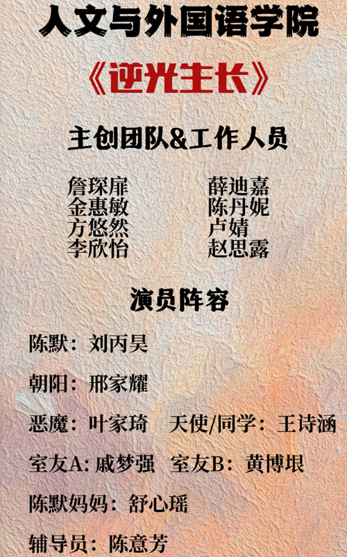 这场精彩的演出凝聚着每一位参与者的心血,指导老师们全程跟进,从剧本构思到舞台呈现给予专业指导,他们牺牲休息时间参与排练,对每个表演细节提出建议;同学们利用课余时间从零开始创作剧本,反复推敲每个细节;幕后同学精心准备道具、调试音效,确保每个环节完美呈现;演员们用心揣摩角色,将故事演绎得真挚动人。正是在所有参与者的共同努力下,我们才能收获最后精彩的表演!