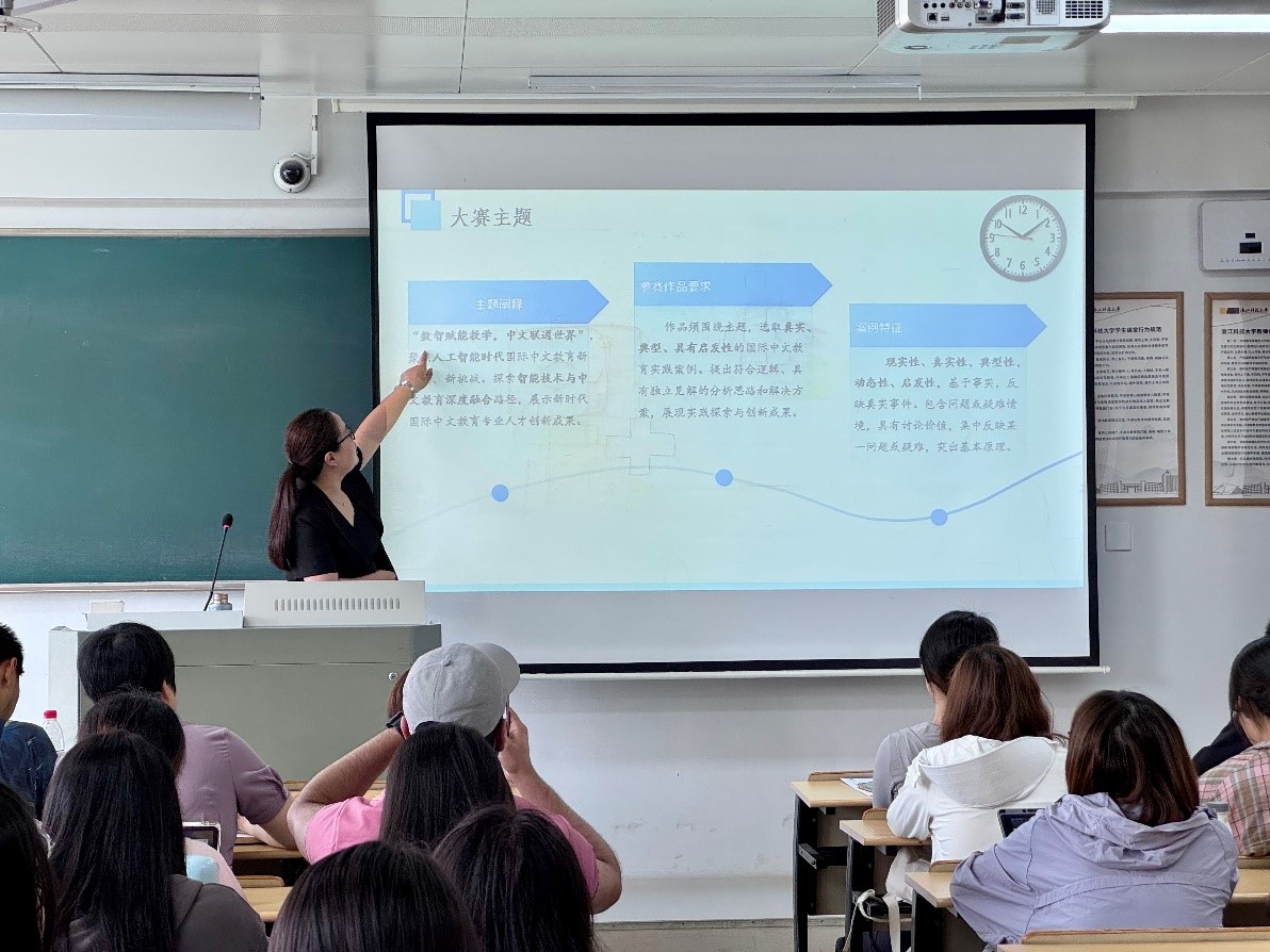 动员会上,凌喆副院长首先强调了本次大赛作为A类竞赛的重要性,并介绍了本届大赛的主题“数智赋能教学,中文联通世界”,特别指出大赛将重点考察运用人工智能(AI)技术赋能中文教学的能力,以及推动中文教育“走出去”的创新实践。她鼓励同学们紧扣时代脉搏,积极参赛。