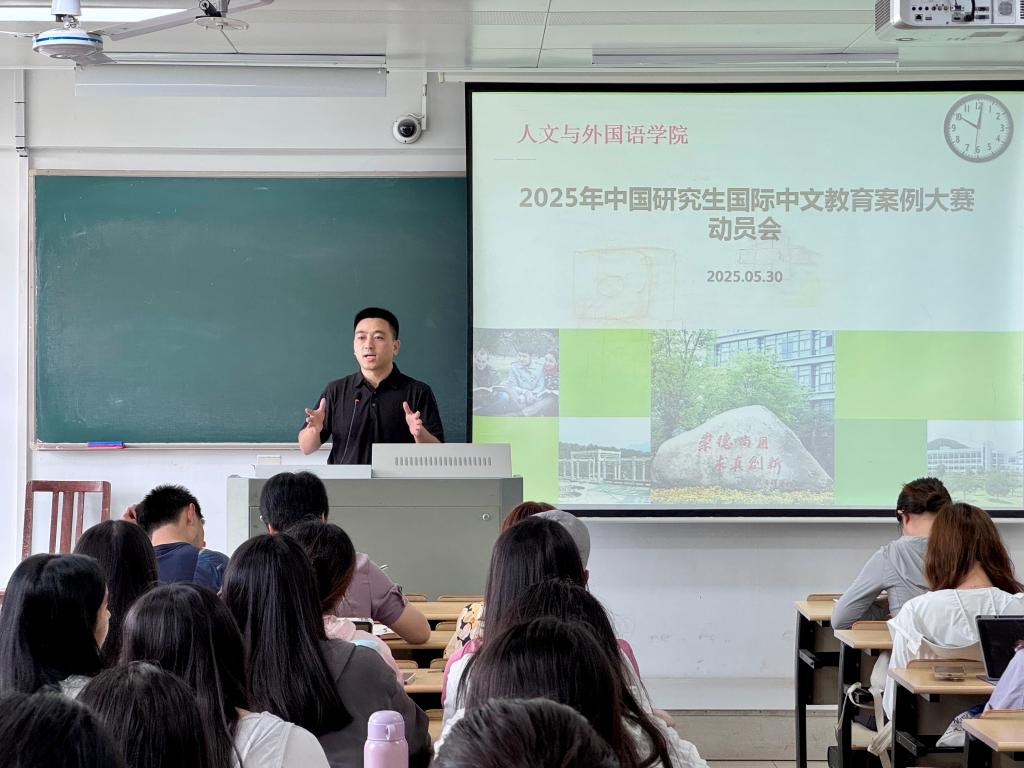 为积极备战2025年第二届中国研究生国际中文教育案例大赛,激发研究生参赛热情,提升案例创作水平,人文与外国语学院于5月30日上午召开了大赛专题动员会。本次动员会由副院长凌喆主持,邀请了首届案例大赛全国三等奖获奖团队成员黄毅作经验分享。学院党委副书记王铁军、研究生导师刘红英教授、李华教授、研究生教学办主任金素芳、研究生辅导员翟士超等老师出席会议,全体国际中文教育研究生参会。