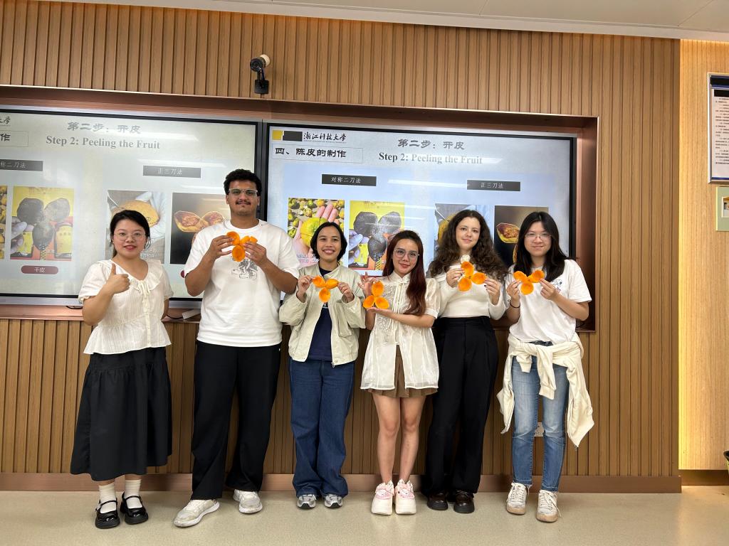 接着她讲解了传统“开皮”手法—“正三刀法”“对称二刀法”及陈皮的晾晒、储存条件。讲解结束,胡敏华带领大家一起体验“开皮”和“翻皮”,“陈皮之传奇,更在于其制作技艺凝聚着代代相传的匠心。这两种刀法历经长期实践与经验沉淀,可最大程度确保果皮完整。新会陈皮炮制技艺也被列入国家非物质文化遗产”。按照中国学生+留学生的分组大家迫不及待实践起来,随着活动进行留学生也逐渐熟练自信,虽然作品仍有一些瑕疵,但大家在交流中成功跨越了语言与文化的障碍,让陈皮制作技艺这一传统文化瑰宝,成为连接不同文化交流的纽带。