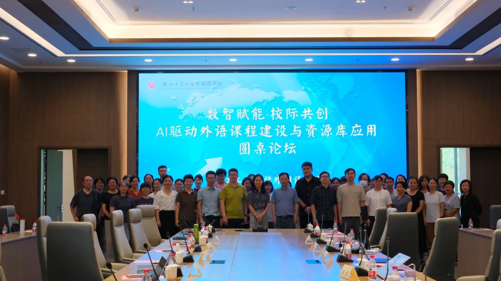 2025年9月15日上午,浙江工业大学外国语学院在屏峰校区板球馆312会议室成功举办“数智赋能·校际共创:AI驱动外语课程建设与资源库应用圆桌论坛”。本次论坛汇聚了来自北京航空航天大学、浙江师范大学、浙江工业大学、浙江外国语学院、浙江科技大学、杭州电子科技大学等多所高校的专家学者,共同探讨人工智能技术与外语课程深度融合的路径与机制。