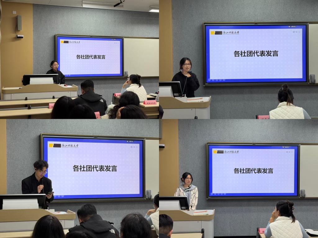 随后,我院社团管理负责人朱可莹对《浙江科技大学学生社团星级评定细则》进行系统解读,强调规范是社团发展的基石,活动质量与宣传效果是提升影响力的关键,各社团要充分认识星级评定的重要导向作用,以此为契机,不断加强自身建设,提升发展内涵。社团管理部门部长杨希月围绕社团活动与宣传材料审批流程、材料提交规范等内容进行详细说明。她在发言中指出,学生社团是校园文化建设的重要载体,是落实立德树人根本任务的有效平台,做好社团管理工作责任重大、使命光荣。希望各社团负责人进一步增强责任意识,认真履行职责,共同推动我院社团工作再上新台阶。