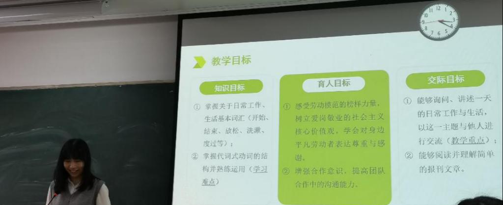 在传授知识的同时,教师们坚持立德树人为本,将思政教育有机融入课堂。教师在课程中充分发挥思政的“隐性”特点,设计注重内容设计的融合性、目标的隐藏性和教学过程的自然性,从而巧妙地将思政目标融于语言知识目标和交际能力目标之中,在传授语言知识和提升交际能力的同时,将思政内容自然呈现,使其自然渗透,而不现其形。学生在“不设心里防线”的前提下,乐于接纳外语课程中所传递的思政教育内容,从而实现育人效果,帮助学生树立正确的价值观。