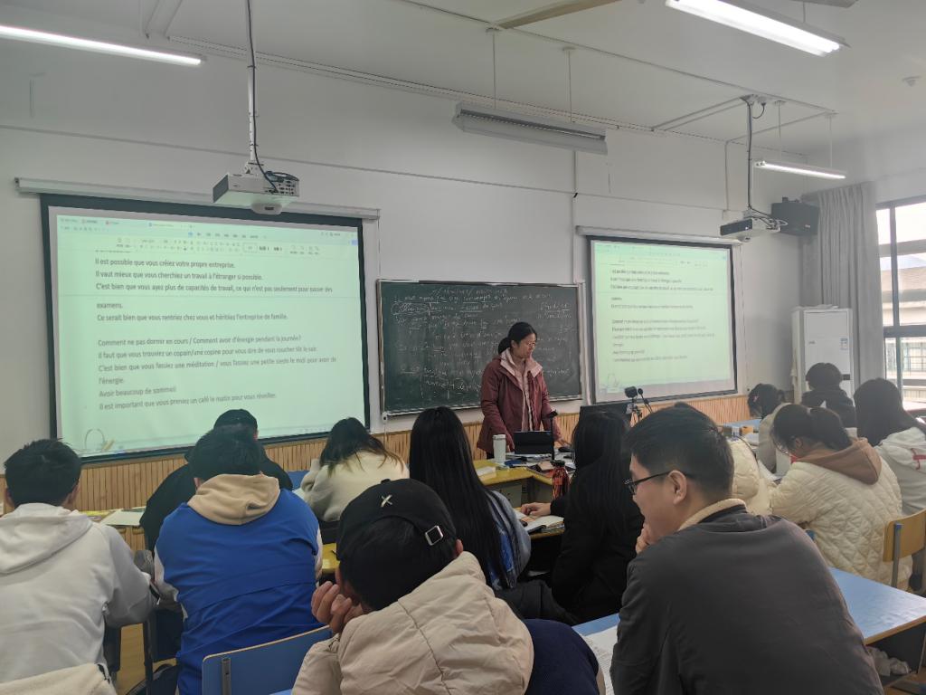 深耕课堂,示范引领。11月29日,法语教学部组织大二教学组的老师集体观摩了周杨老师的《法语3》开放课,当日课时的主要授课内容为《你好!法语2》的第15课“Demain, j’arrête...”。周杨老师备课充分,整体课时设计紧凑,教学环节设计科学合理,根据同学们对所讲知识的理解与掌握情况,及时调整教学方式,师生互动有效,氛围良好。课后,法语老师就开放课上的一些具体问题进行了集体讨论,为进一步提升教学质量打下基础。