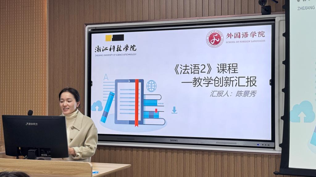 陈景秀老师通过背景分析和创新思路两大方面向我们介绍了《法语2》这门课,并且引入了较为新颖的“五感”教学方法,使学生们通过实践加深对学习内容的印象并激发学生进一步探索的兴趣。