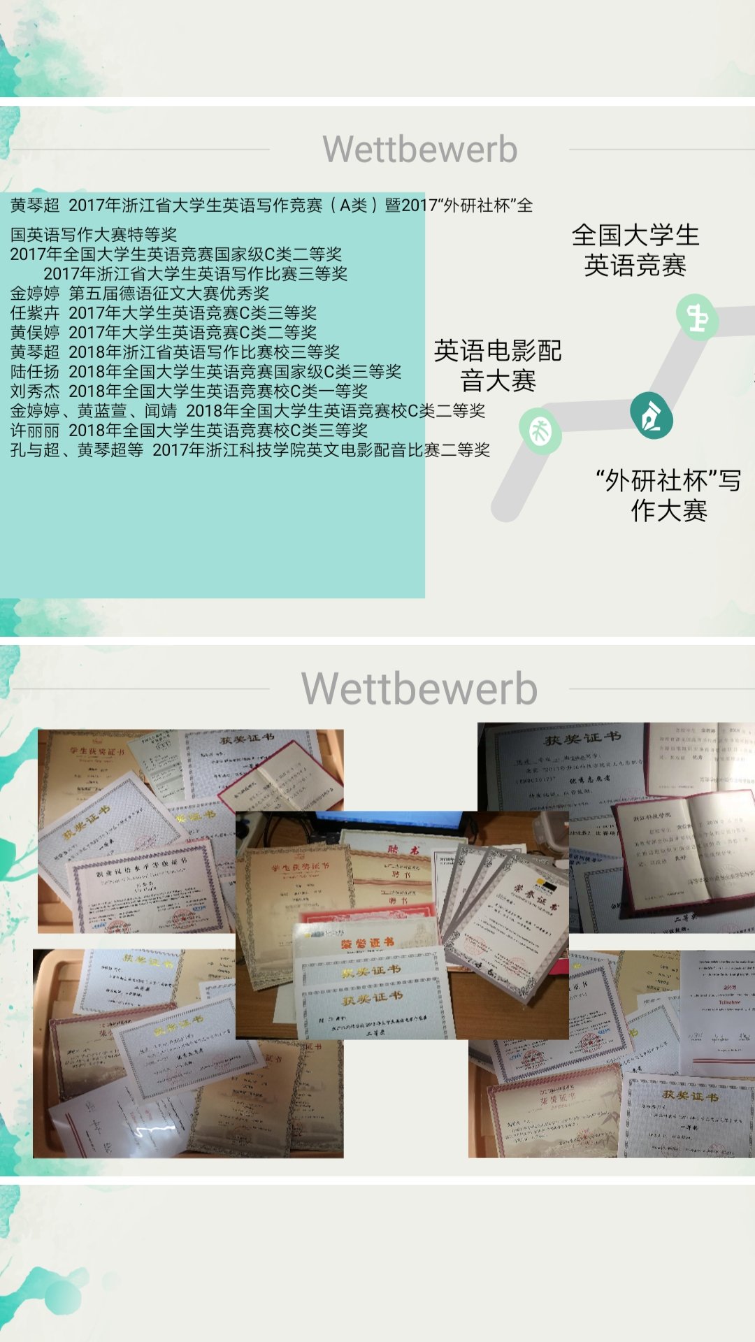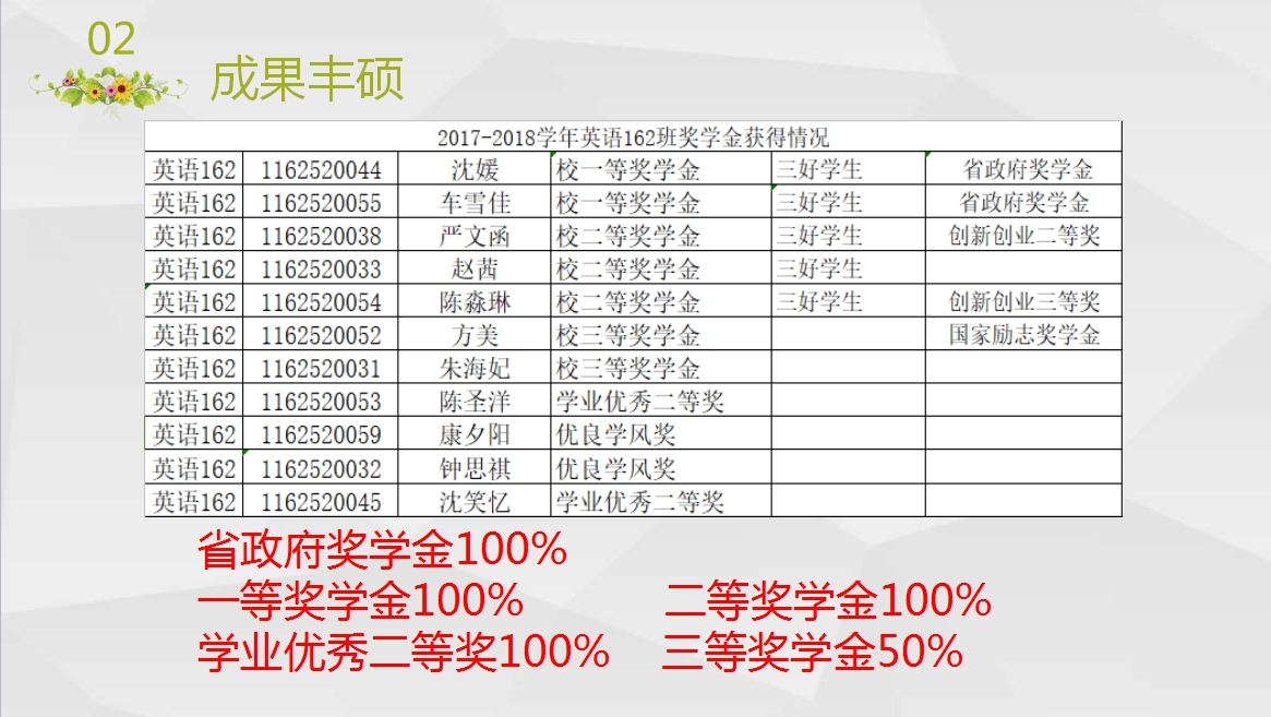 一路向阳,一路绽放,英语162班是第15号上台展示。台上台下的老师和学生心里都是紧张的,由于特殊原因,班级准备时间较短,在最后两天争分夺秒完善展示材料,同时尽量让三个展示者的配合做到最好。但另一方面,我们心里也是有底的,试问哪个班级能够做到省政府奖学金、一等奖学金、二等奖学金和学业二等奖学金全部专业占比100%,这就是特有学风的成果,而他们的成果又何止这些。