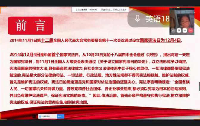 在第八个国家宪法日来昨之时,外国语学院举办了“让宪法更加深入人心”的主题团日活动。12月7日,由外国语学院学生党员英语183朱映燃同学为大三大四的入党积极分子和预备党员做了一场线上微讲座。