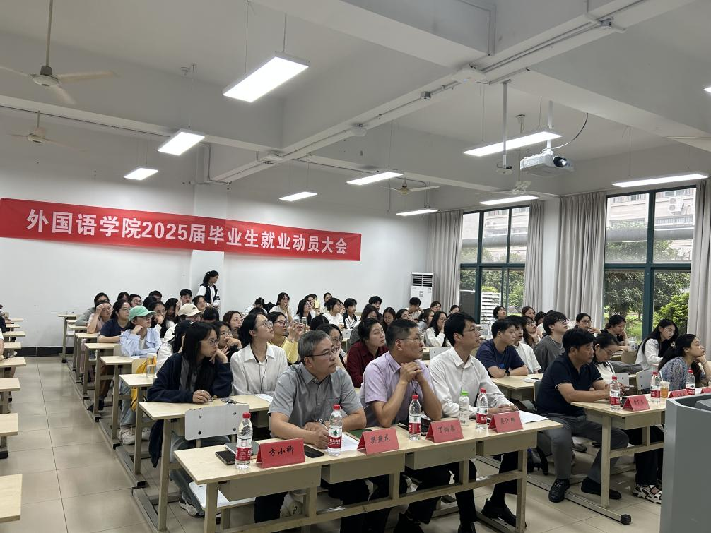 为进一步做好2025届毕业生就业工作,9月25日下午,外国语学院举办了2025届毕业生就业动员大会。院长樊燕龙、党委书记丁炳泉、党委副书记方小卿、招就处老师俞广良、毕业班班主任叶桦、夏翠君和青年企业家、我院优秀校友2011届毕业生吴江璐出席本次会议,会议由辅导员王美洁主持。