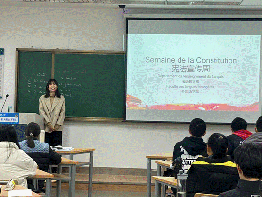 扎实推进法治教育进课堂,充分发挥课堂主渠道作用,科学设计宪法法治教育内容,通过宪法相关内容开展学习,在各类课程中积极挖掘法治教育元素,发挥课程思政育人功能。英语系充分利用今年试点使用的教育部推荐教材《理解当代中国:英语读写教程》,将其中第5单元“公平正义的社会”中的课文“推进全面依法治国”作为本次教育的素材,教师们围绕习近平总书记提出的依法治国“11个坚持”进行了中英文双语讲解,使学生深刻理解其中的内涵,对中国特色社会主义法治理论有了更深的感悟。大学外语部工程师英语教研组在教学过程中坚持思政育人,结合“工程师伦理”和“工程师价值观”等单元有机开展宪法法律知识教育,强化学生的道德、纪律和法治意识,引导学生践行社会主义核心价值观,为国家培养具有良好综合素养的工程类专业人才,服务社会主义现代化建设。法语教学部老师们以法语词典对宪法一词的定义入手,在法语的语言环境下,向学生重申了一国宪法作为国家根本大法的重要意义,并带领学生一起用法语对宪法的第一句话进行了翻译,让学生在理解和领会宪法精神的同时,锻炼实践了自身的语言技能,得到了良好的效果。