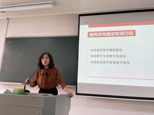 随后,教学副院长王旭莲介绍了外国语学院教风学风建设专项行动,并号召全院教师以优秀成绩通过明年本科审核评估为目标,结合学校教风学风建设专项行动,做好“三加强”,即加强课堂教学规范建设,加强教学文档数字化建设,加强课堂教学质量提升建设。