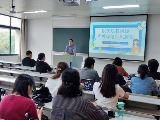 会议伊始,院长樊燕龙做了题为“以优质教风促优秀师德师风建设——以德立身、以德立学、以德施教、以德育德”的主题讲座。讲座首先学习了怀庆鹏部长在教育部师德师风建设工作推进暨师德集中学习教育启动部署会上的讲话,从坚持政治引领、坚持师德违规“零容忍”、做好教师精神引领、完善教师培养管理四个方面展开论述;随后介绍了新时代师德师风的三大变化,以及违反师德师风的四大具体表现,最后重温了《新时代高等学校教师职业行为十项准则》,号召全院教师认真学习领会习近平总书记关于师德师风的重要指示精神,坚持加强思想政治引领,坚持弘扬尊师重教社会风尚,坚持师德师风第一标准。