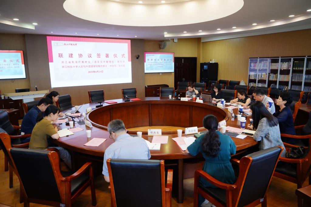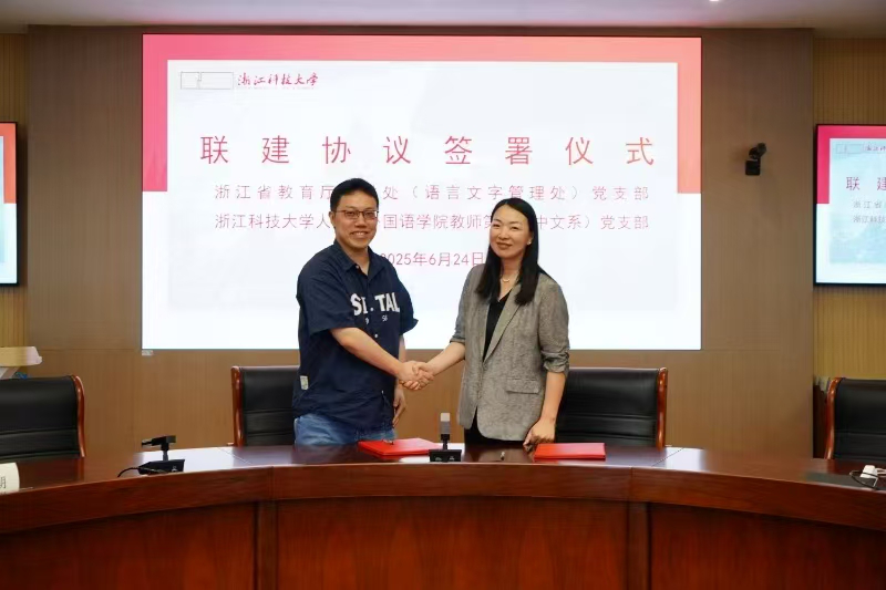 6月24日,省教育厅教材管理处(语言文字应用管理处)党支部与浙江科技大学人文与外国语学院教师第五(中文系)党支部党建联建协议签署仪式在浙江科技大学小和山校区隆重举行。省教育厅教材处(语用处)党支部书记、处长徐漾同志和中文系党支部书记吴众同志分别带领支部成员出席仪式,学院院长樊燕龙、省语言文字推广基地执行主任叶晗、副院长方小卿共同见证。签约仪式由学院党委书记邵莉敏主持并致辞。