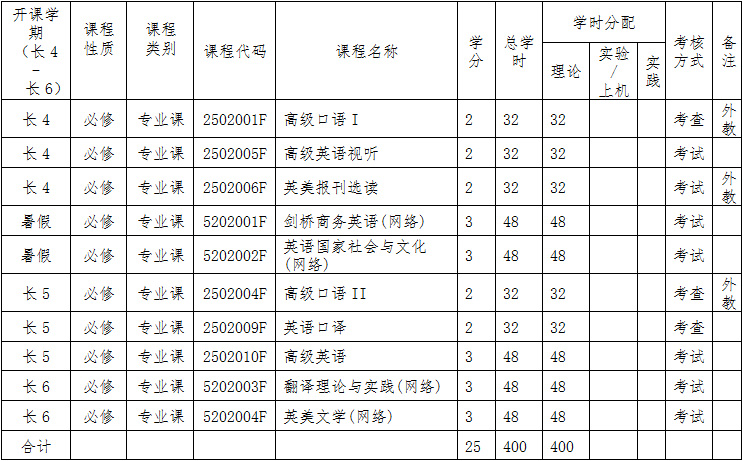 英语辅修专业教学计划表