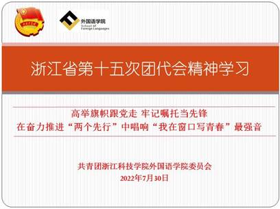 7月22日,共青团浙江省第十五次代表大会在杭州开幕,省委书记袁家军、团中央书记处常务书记汪鸿雁等发表讲话。他们充分肯定了省第十四次团代会以来我省共青团工作取得的成绩,同时也强调要以习近平总书记关于青年工作的重要思想为指导,扎实推进我省共青团事业创新发展,对未来五年的工作提出了总体要求,确定了今后五年的奋斗目标和重点工作格局。为加强外国语学院青年学子对此次团代会精神的深入学习,团委书记王美洁于7月30...